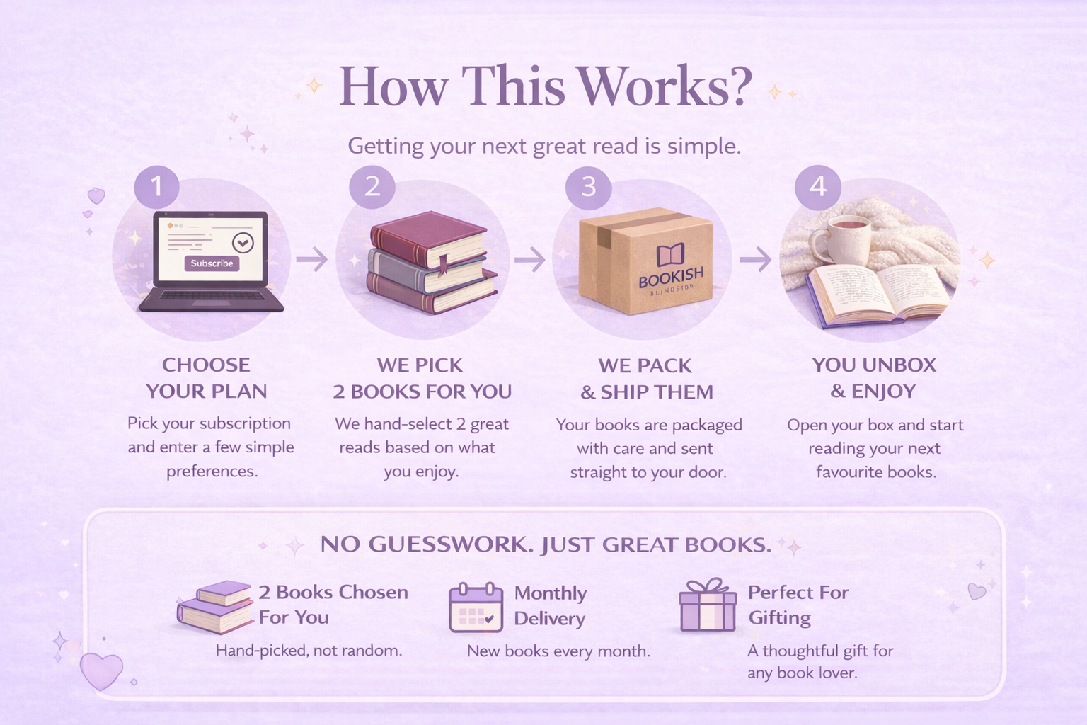 2 handpicked Books + Tea + Bookmark - Curated for your perfect escape £17.99/ Month - Free Delivery Cancel anytime