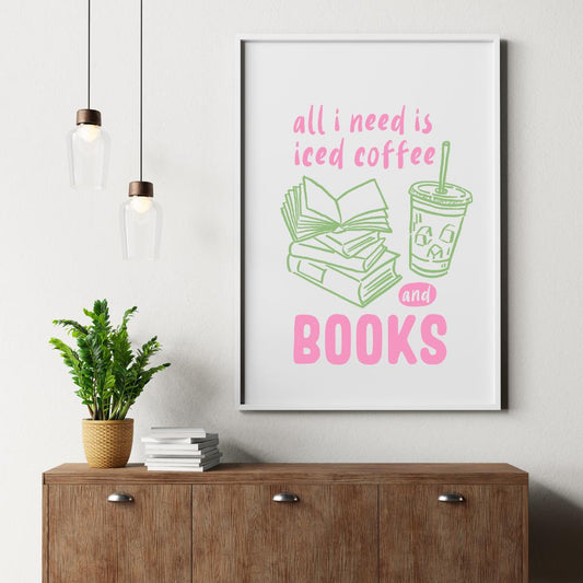 All I Need is Iced Coffee and Books PNG | Bookish Digital Sticker | Cozy Reader Clipart | Coffee & Books Printable | Digital Products