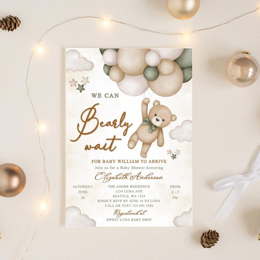 Bearly Wait Baby Shower Invitation | Editable Canva Template | Neutral Teddy Bear Theme | Instant Download | Baby Boy or Girl Invite