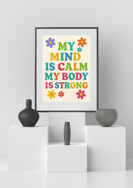 My Mind is Calm My Body is Strong Wall Art | Retro Positive Affirmation Printable | Mental Health Quote | Rainbow Self-Care Decor | PNG