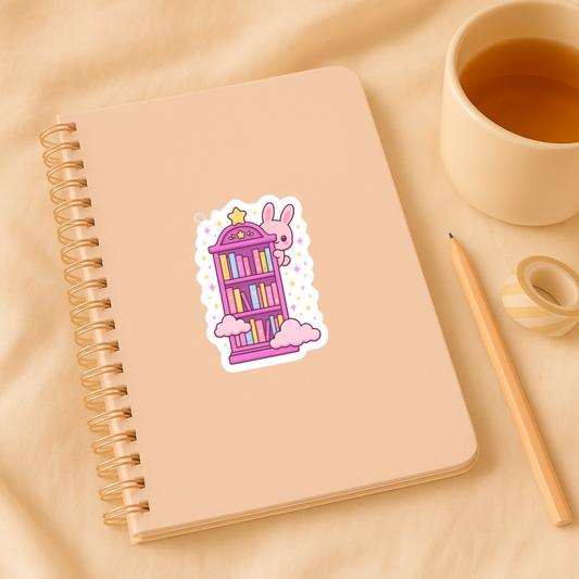 Kawaii Bookshelf Bunny Sticker – Cute Book Lover Vinyl for Planners & Gifts