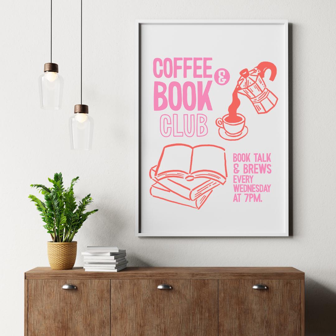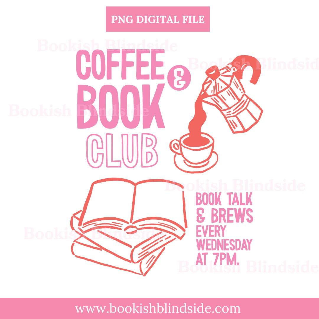 Celebrate your weekly bookish brews with this Coffee & Book Club digital sticker! Featuring hand-drawn illustrations of a moka pot, coffee cup, and open books in a bold pink & red color scheme, this PNG file is perfect for digital planners, book club invites, printable signs, or custom stickers for your reading nook.