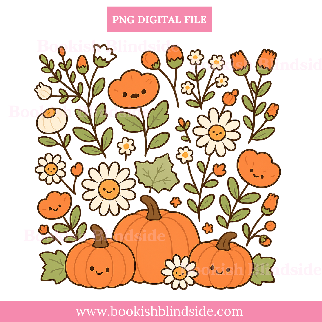 🎃🌼 Add cozy charm to your fall crafts with this adorable Kawaii Pumpkin PNG set! Featuring smiling pumpkins, autumn flowers, daisies, and leafy details in warm orange, cream, and green tones — this cheerful fall design is perfect for seasonal stickers, planner pages, sublimation, and scrapbooking.