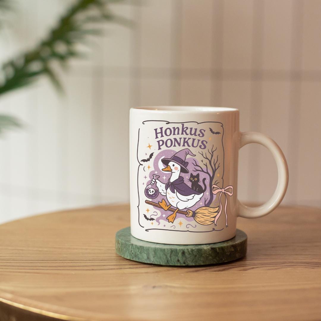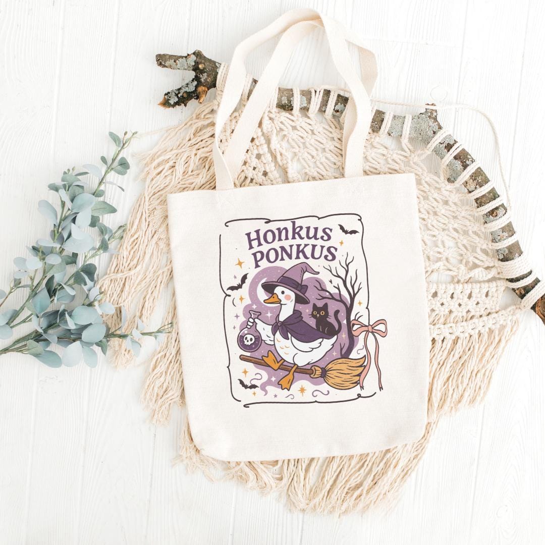 Add a little witchy whimsy to your Halloween crafts with this hilarious “Honkus Ponkus” PNG featuring a goose in full witch costume flying on a broomstick, with a potion bottle in hand and a black cat companion. Perfect for shirts, mugs, posters, and spooky-season stickers!