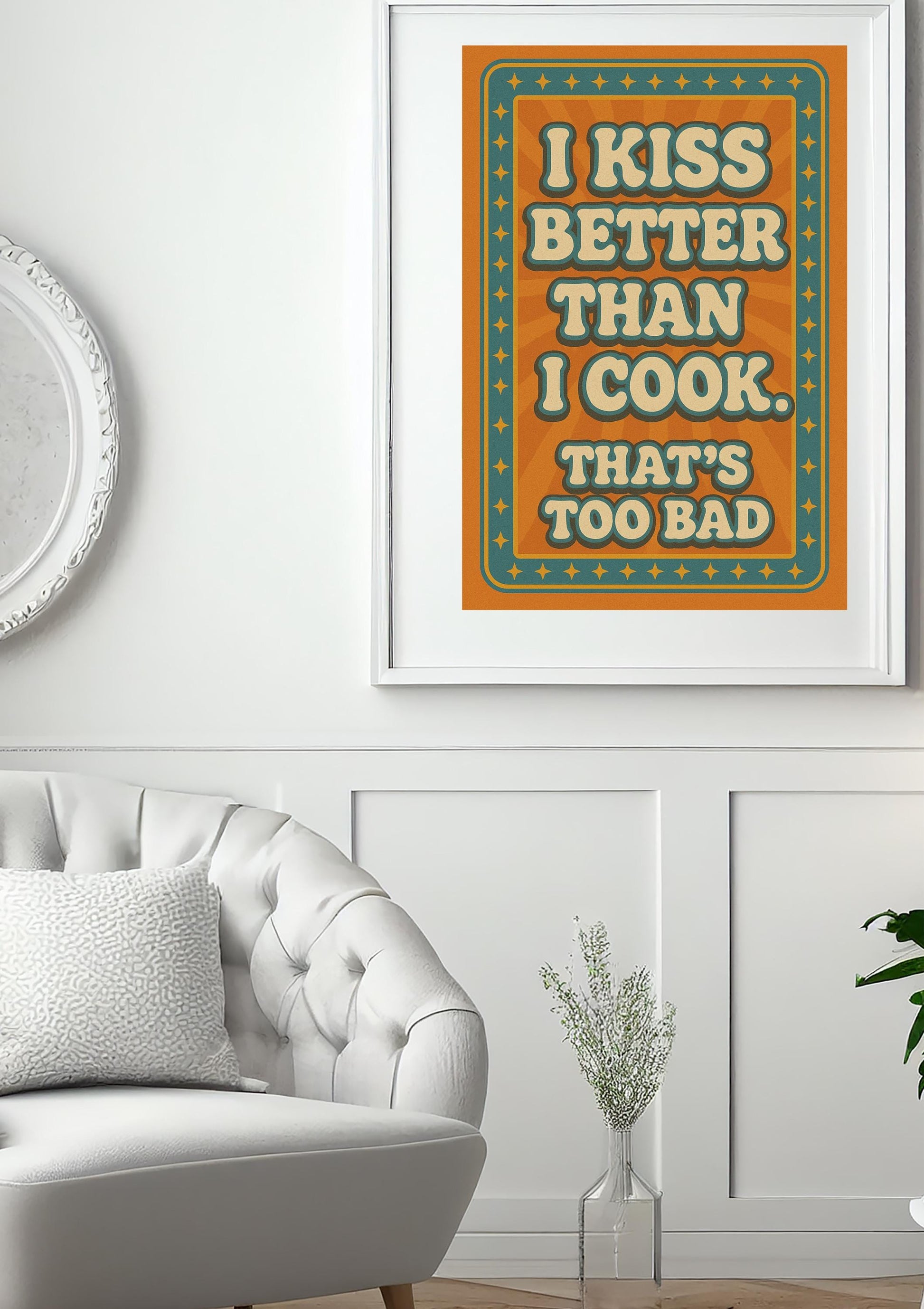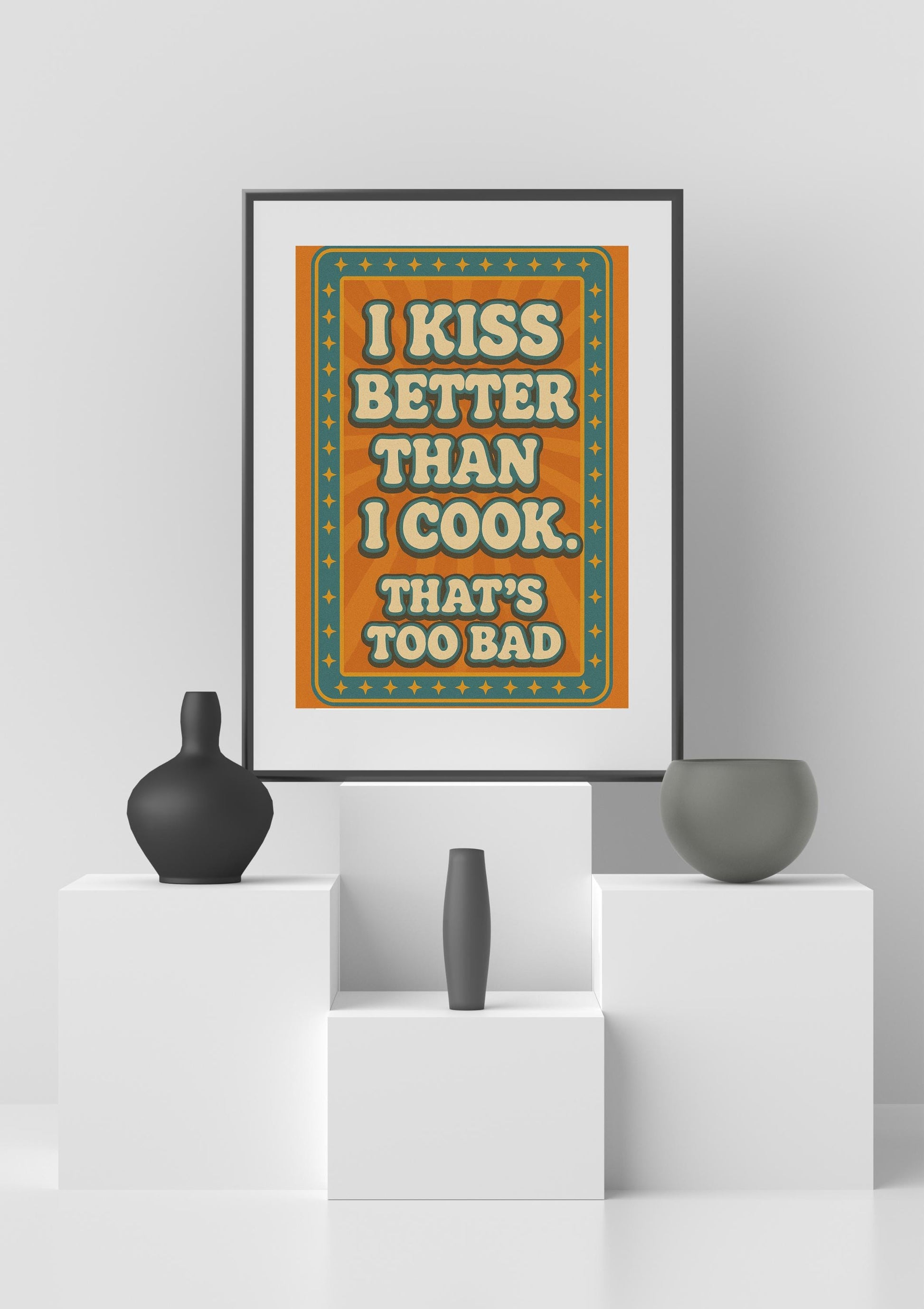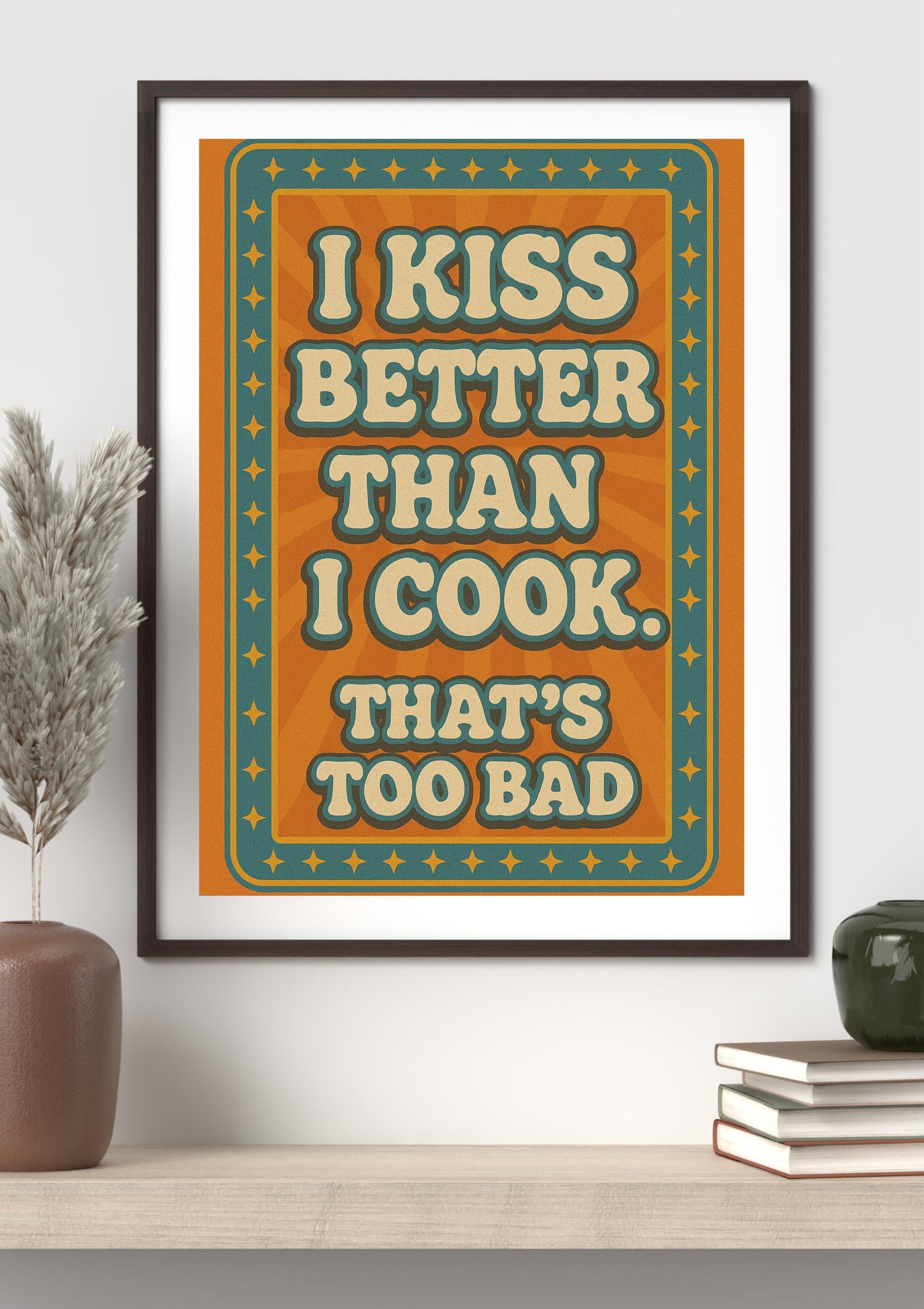 funny kitchen wall art, kiss better than I cook print, retro quote poster, bold typography printable, vintage humor sign, sassy kitchen decor, instant digital download, flirty wall art, printable for couples, Etsy kitchen quote art