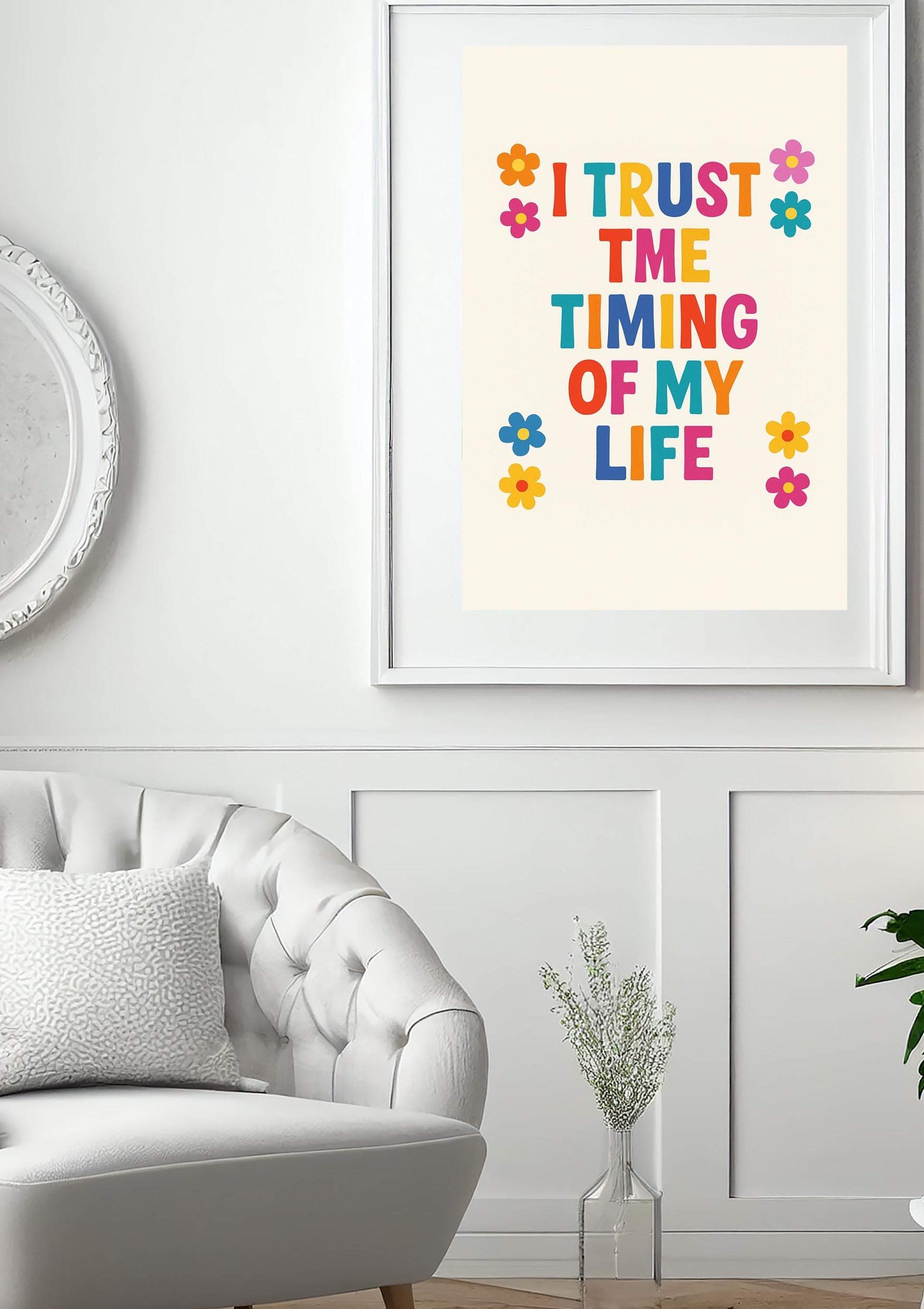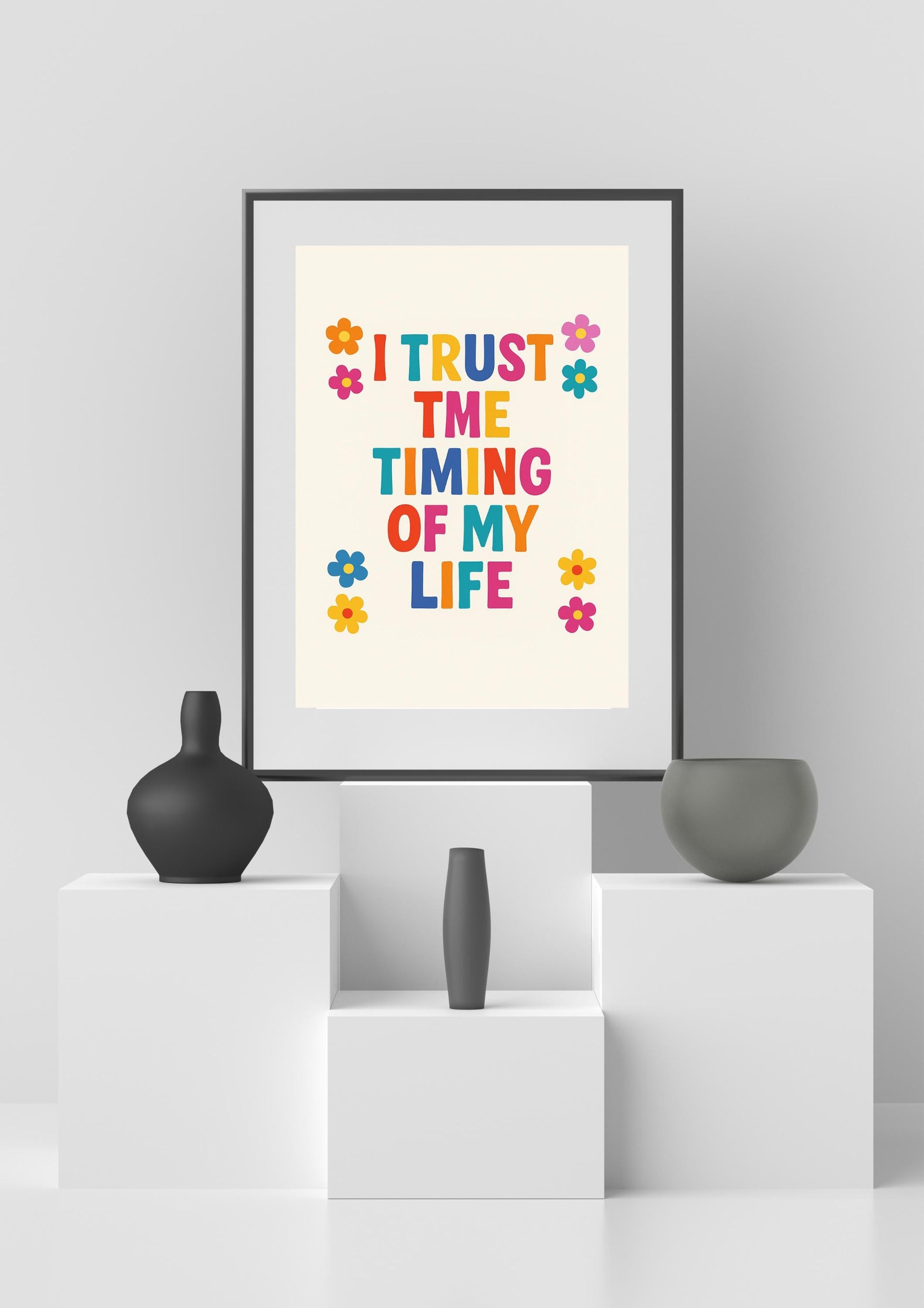 Brighten your space and your spirit with this bold and cheerful "I Trust the Timing of My Life" printable poster. Featuring colorful retro typography and whimsical flower details, this affirmation print is perfect for manifesting calm and positivity in your daily routine.