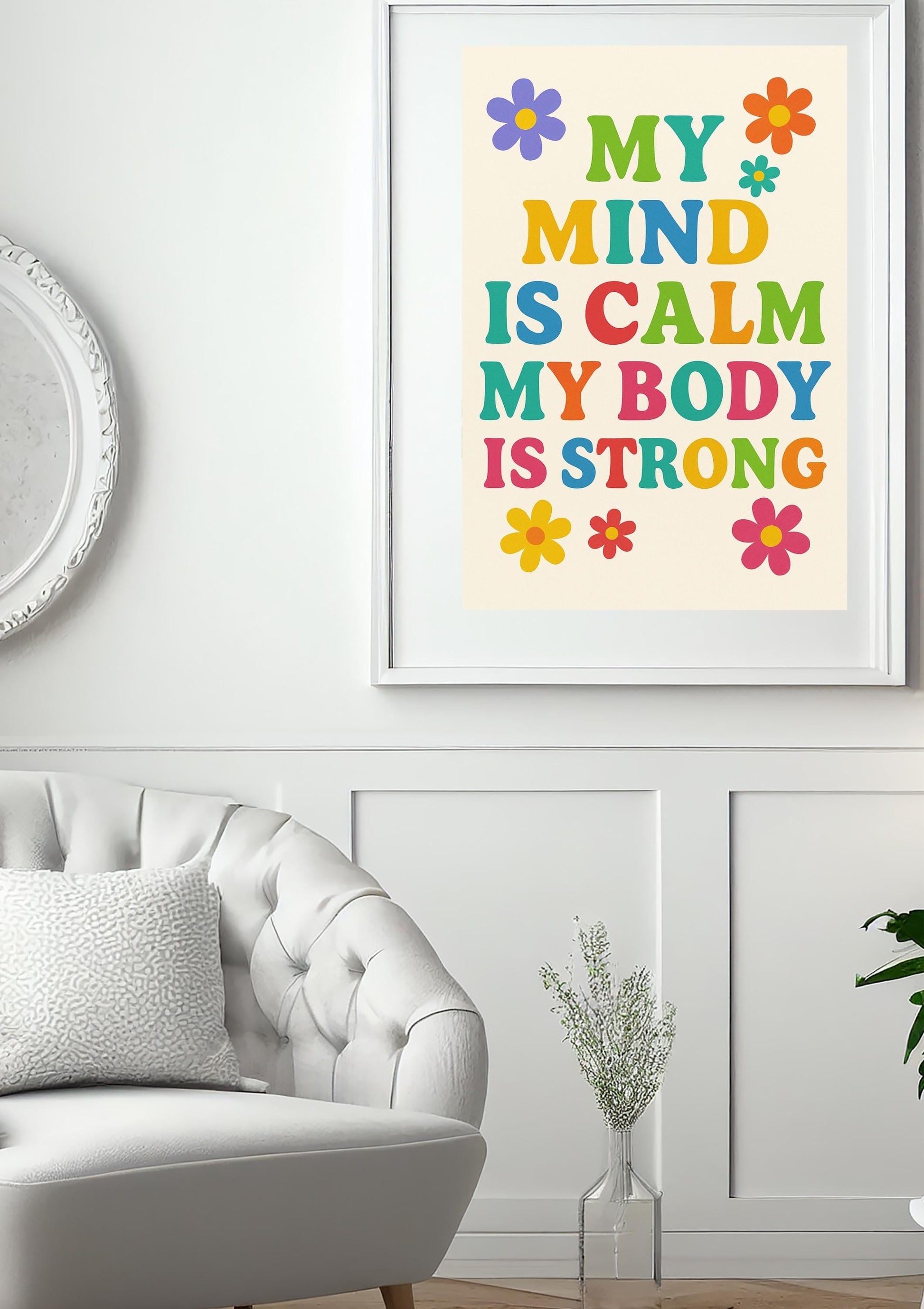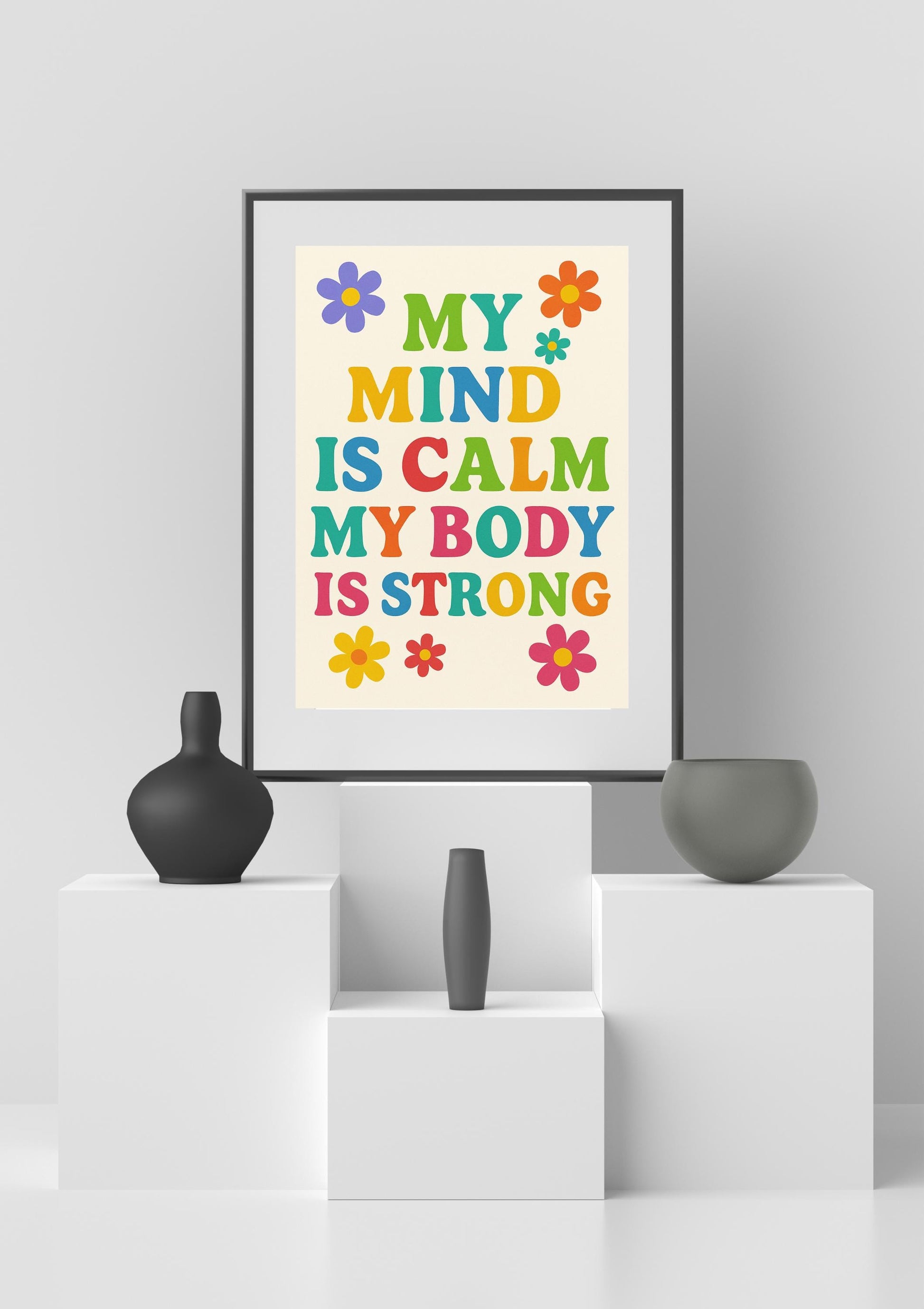 affirmation printable, self love quote, rainbow wall art, positive mental health print, my mind is calm poster, my body is strong art, digital wellness download, retro printable quote, kids mindfulness decor, Etsy instant download, flower power digital print