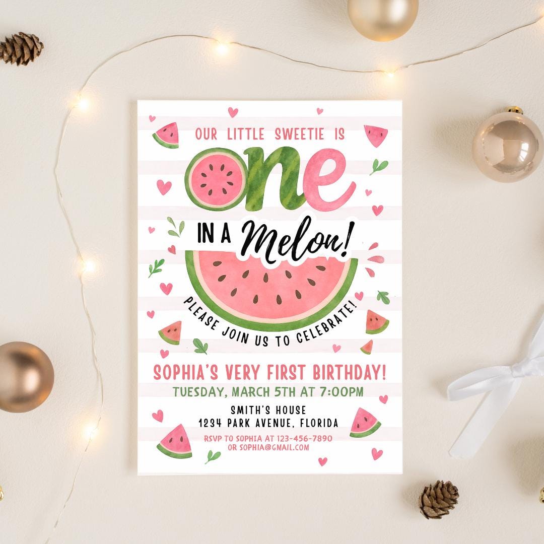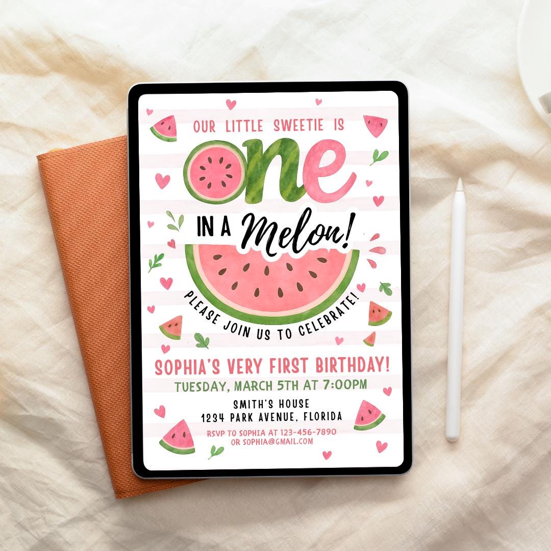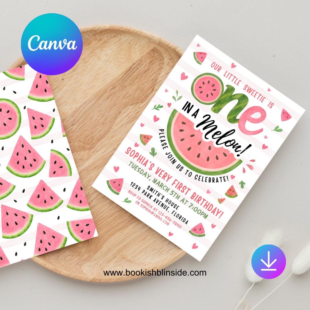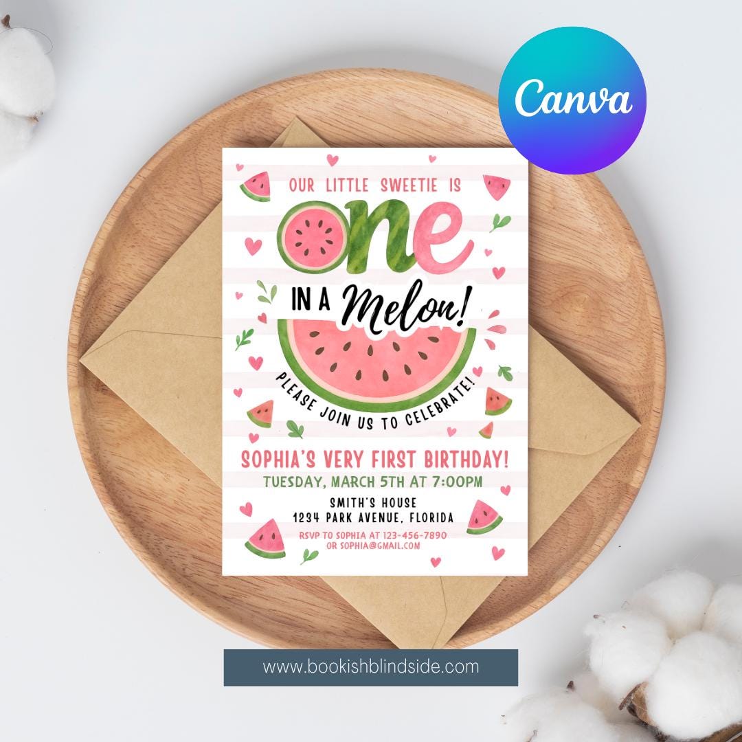 one in a melon birthday, editable watermelon invitation, Canva baby invite, fruit theme birthday, DIY party printables, first birthday girl invite, pink and green party, summer birthday invite, bookish blindside