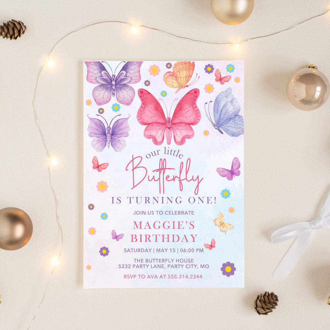 🦋 Editable Butterfly Birthday Invitation | Canva Template | Girl's 1st Birthday Party | Instant Download | Floral Butterfly Invite