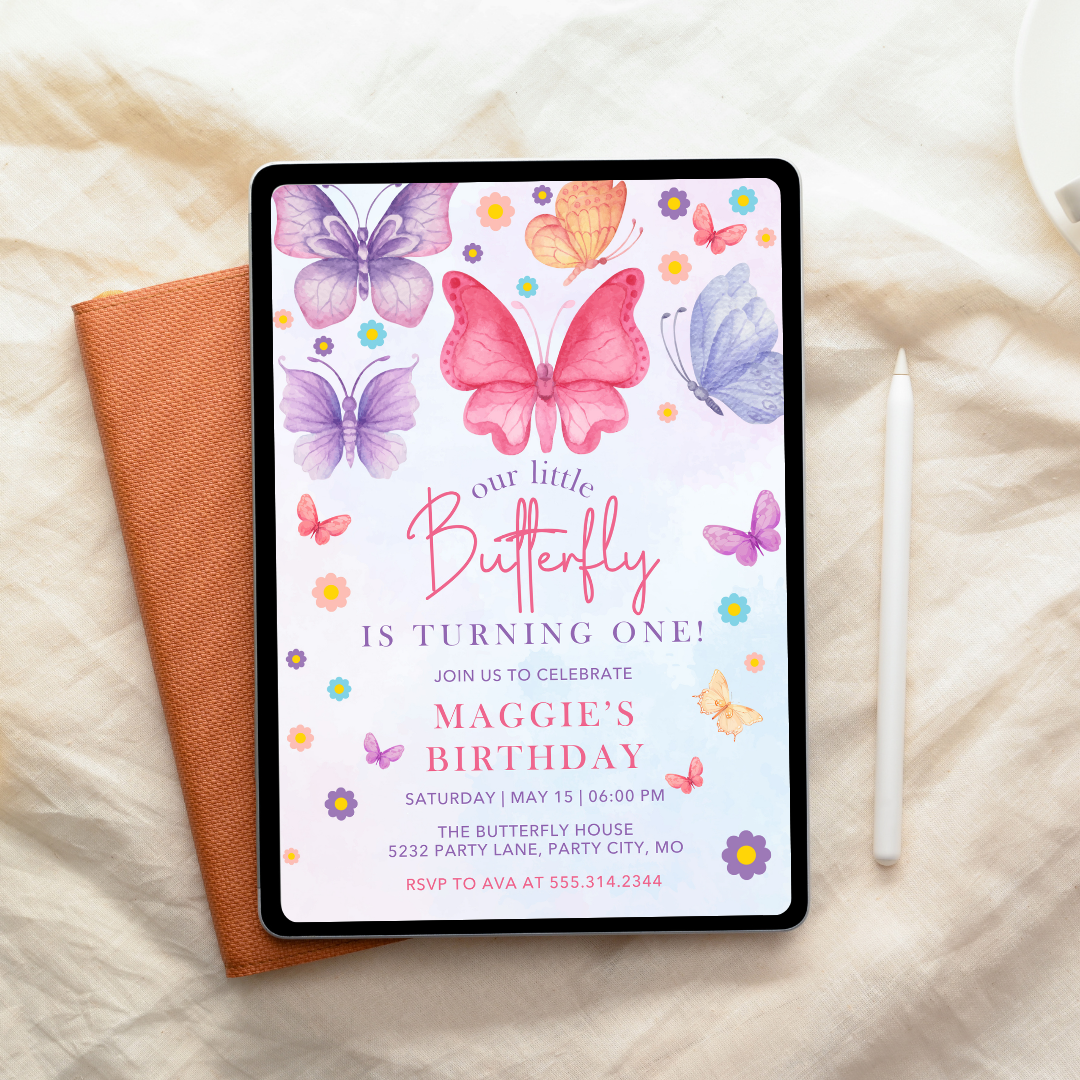 Make your little girl's first birthday extra special with this adorable Butterfly Birthday Invitation! Designed with pastel florals and colorful butterflies, this editable Canva template is perfect for a spring or garden-themed celebration.
