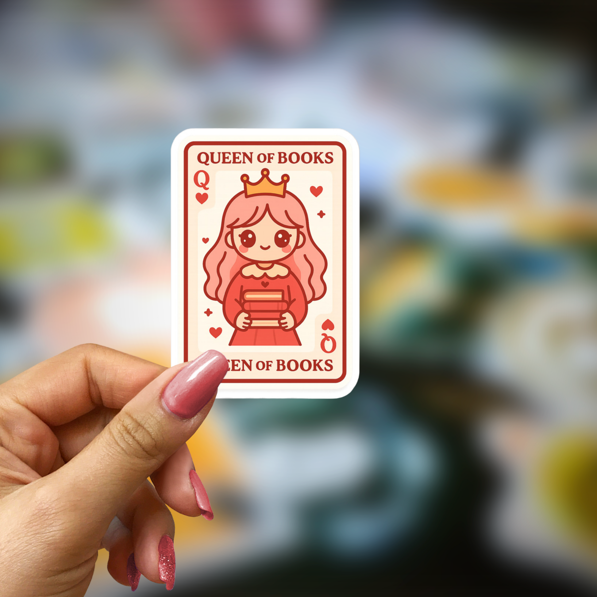 Claim your title as the ultimate reader with our Queen of Books sticker! This kawaii-inspired playing card design features a blushing book girl with a crown and a stack of books – perfect for decorating your Kindle, laptop, journal, water bottle, or reading nook.