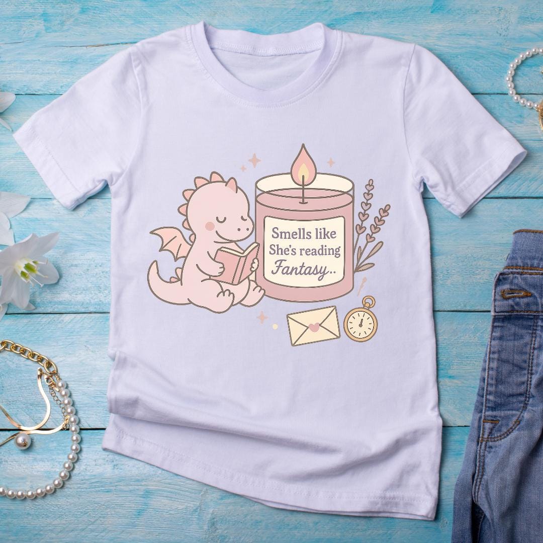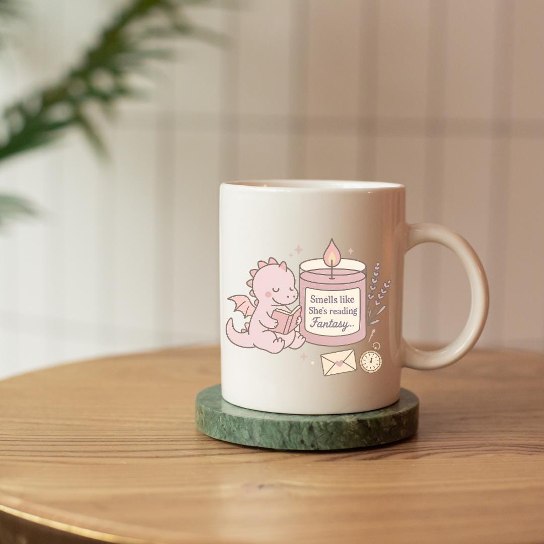 Bring a touch of magic to your world with this adorable pastel pink dragon snuggled up with a book beside a candle that reads "Smells like she’s reading Fantasy...". ✨
